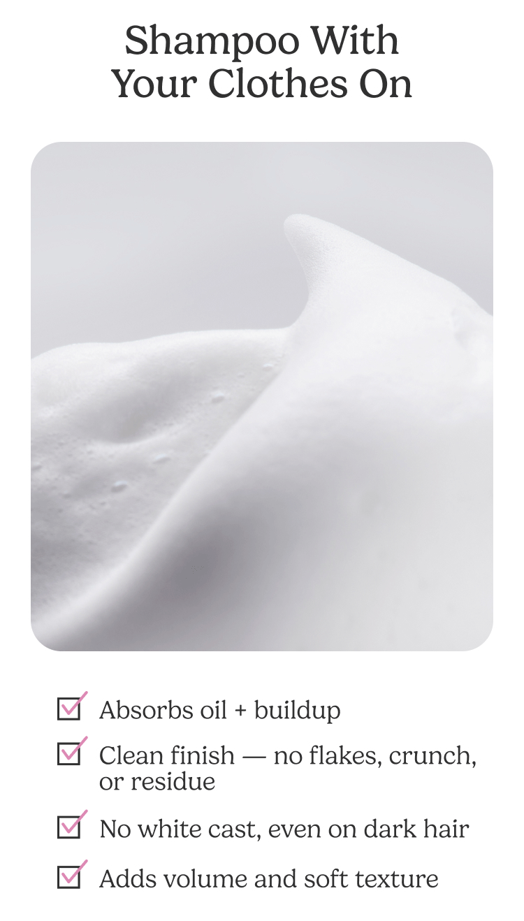These fine bubbles ensure the product works right down to the roots, massaging to lift away impurities. Compare that to a traditional dry shampoo (whether it's dispensed via aerosol, shaker bottle or jar) which has a starchy powder as the format-- you're not able to evenly coat each hair strand, which can lead to uneven application.