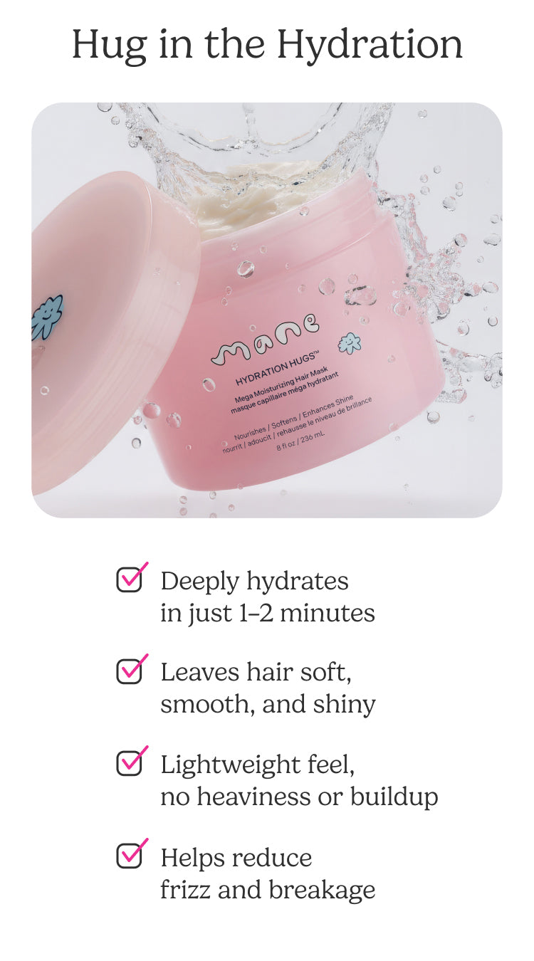 Hydration Hugs Mega Moisturizing Hair Mask delivers fast, visible hydration in just 1–2 minutes—when your hair needs a hug. Leaves hair feeling silky, soft, and shiny, never weighed down.